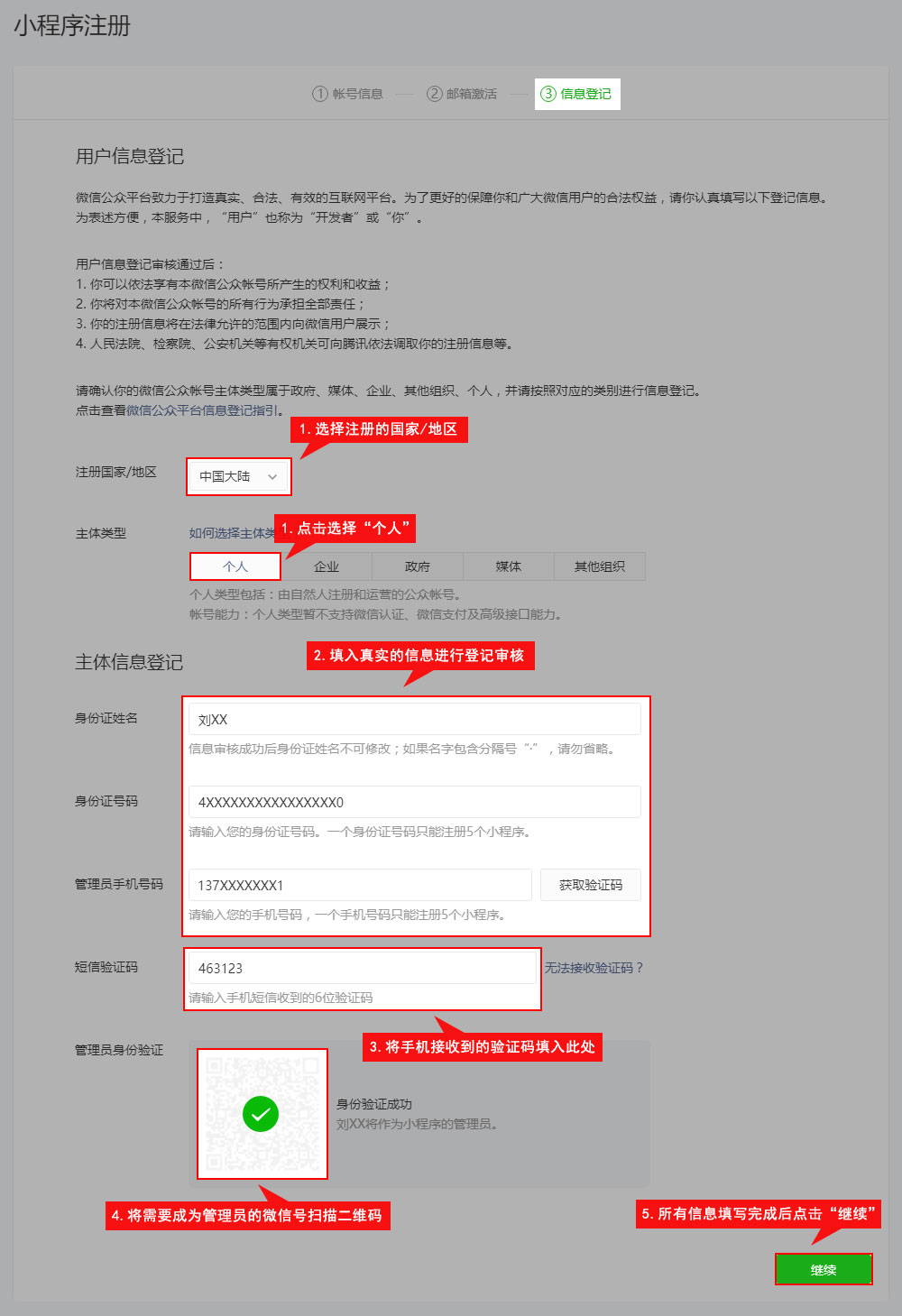 • 点击激活链接后,继续下一步的注册流程。根据实际情况选择国家/地区、主体类型,完善主体信息和管理员信息。此处主体类型选择“个人”。