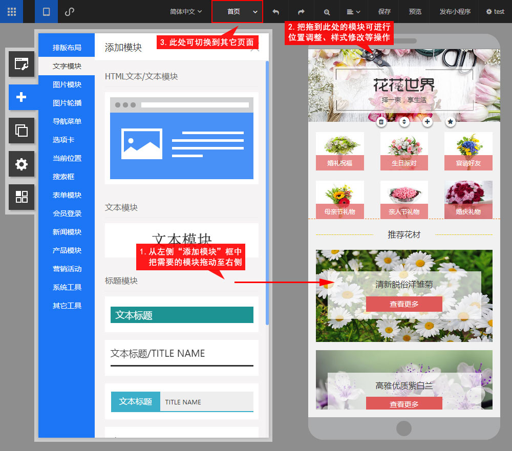 • 在此处可以对小程序的各页面进行模块添加、样式修改等操作,制作属于自己的微信小程序。