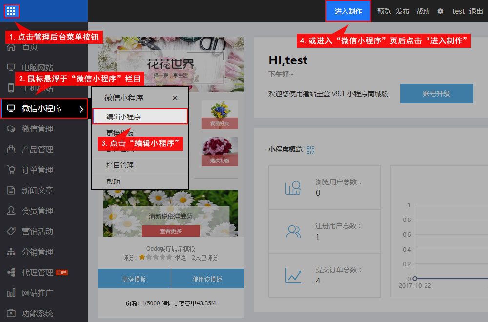 • 通过选择左上方“管理后台菜单”按钮——“微信小程序”——“微信小程序”——“进入编辑”进入小程序编辑页面。