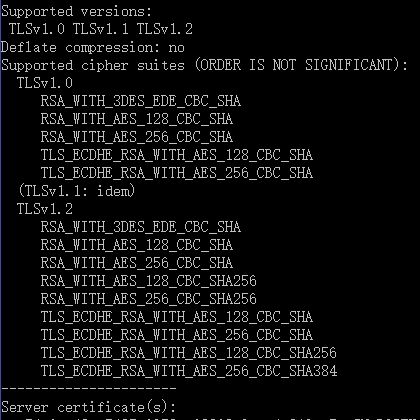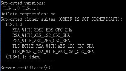 测试结果显示是支持SSL3.0的并且不支持TLS 1.2。证书使用SHA1签名算法不够强。这点比较容易接受,因为Windows服务器默认并没有开启TLS1.2。