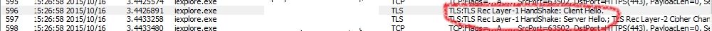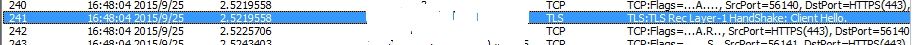 这和我遇到的问题完全符合啊,难道是客户端没有发送签名算法扩展?于是用IE试了下访问网站,发现是可以的,于是抓包看一下,用的协议是TLS1.2。证明TLS1.2在服务器上是已经启用的了。有client hello并且服务器也回应了serverhello。