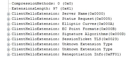 再仔细看客户端的client hello包,里面确实包含了extension信息。